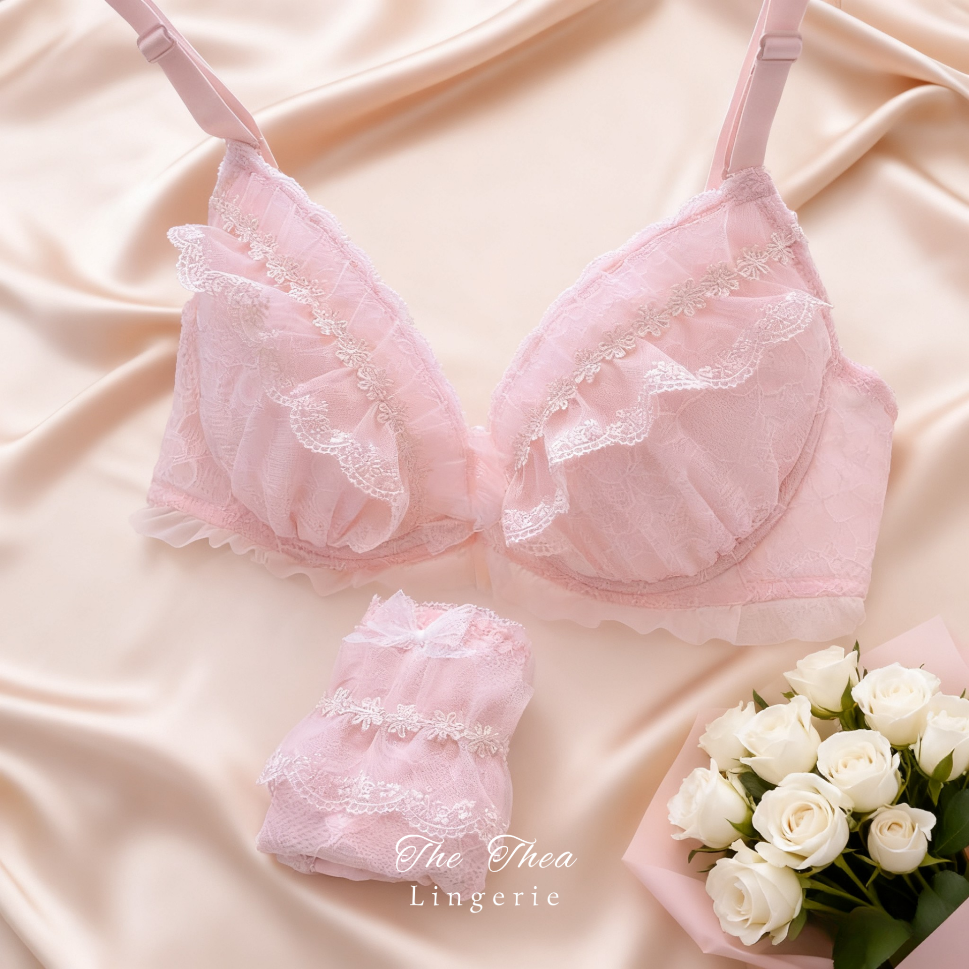 Sweet Ruffled Lace Deep V Hollow Thin Cup Plunge Bra Set