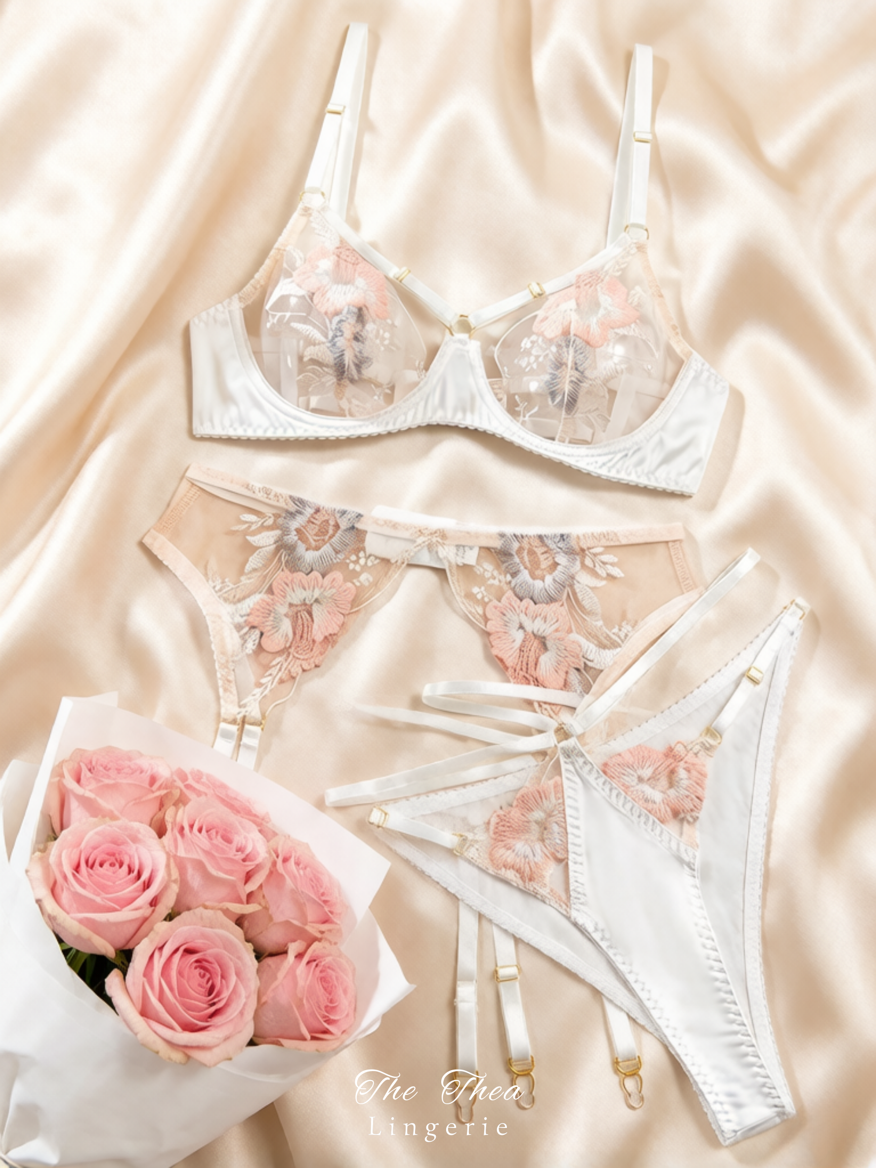Sexy Intricate Floral Embroidery Sheer Garter Belt Three-Piece Bra Set